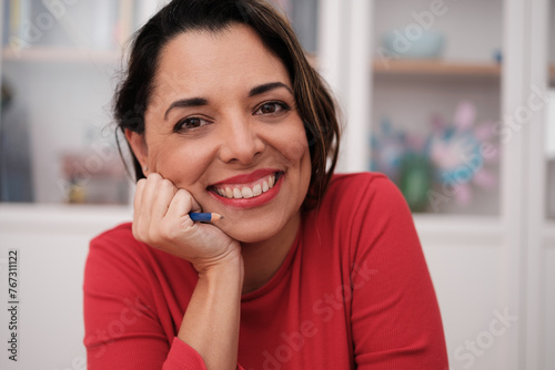 Close-up of businesswoman teleworking from home smiling and efficient. Concept: remote work