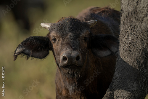Close-up of Cape buffalo (Syncerus caffer) watching camera in Chobe National Park; Botswana