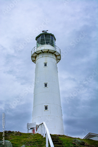 Close-up of Cape Egmont Lighthouse on a gloomy winter day. Taranaki, New Zealand