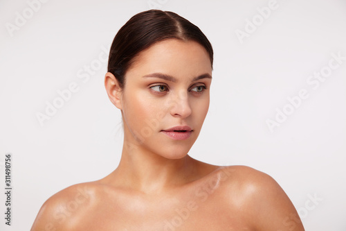 Close-up of charming young brunette female wearing natural makeup and casual hairstyle while posing against white background, looking aside with calm face