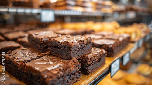 Close-up of chocolate brownies displayed in a bakery.