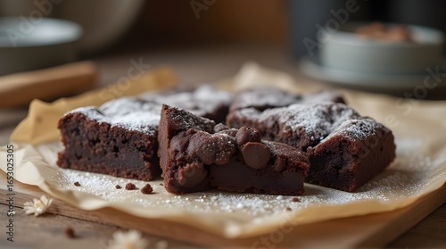 Close-up of chocolate brownies with powdered sugar on parchment paper, rustic kitchen background, natural soft light, delicious dessert stock photo