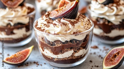 Close-up of chocolate trifle with fig slices, whipped buttercream, and cocoa powder garnish, served in a transparent dessert cup.