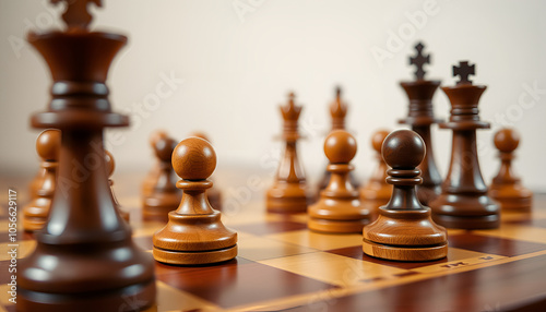 Close-up of classic wooden chess pieces on a chessboard, capturing the beauty of traditional craftsmanship.