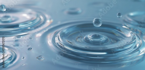Close-up of clear blue water drops creating ripples and splash effects on the surface in a bright natural environment with detailed reflections