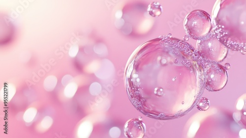 Close-up of clear bubbles with a pinkish magenta hue, floating and dispersing like a molecular group against a soft gradient background. Copy space