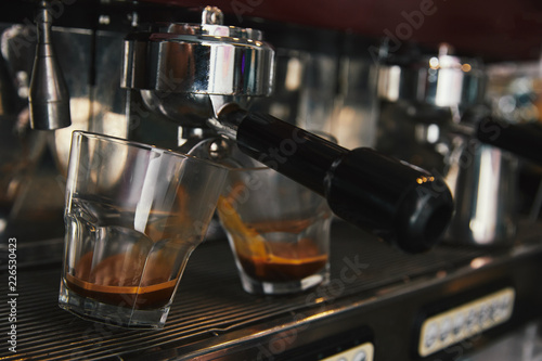 close-up of coffee maker preparing espresso in two cups