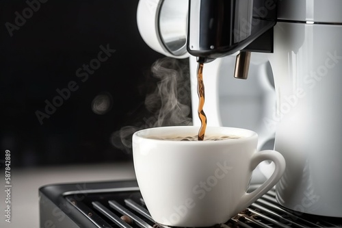 Close-up of coffee water in a white mug flowing out of the coffee machine. AI-generated images