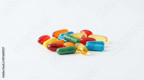 Closeup of Colorful Dietary Supplements on White Surface, Health and Wellness, Photography