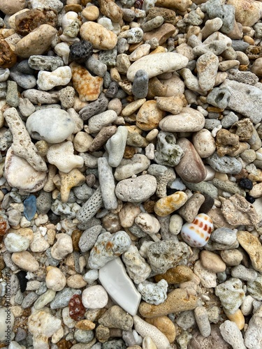 Close-up of colorful pebbles and coral fragments on a beach.stone texture