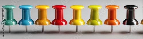 Close-up of colorful push pins arranged in a row on a white with shadow effects