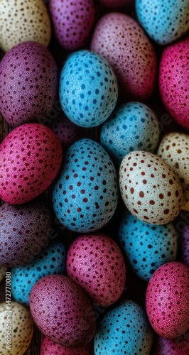 Close-up of colorful speckled egg-shaped candies in pink blue and beige hues.