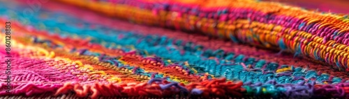 Close-up of colorful woven fabric with vibrant threads in red, blue, and yellow hues creating a beautiful texture and pattern.
