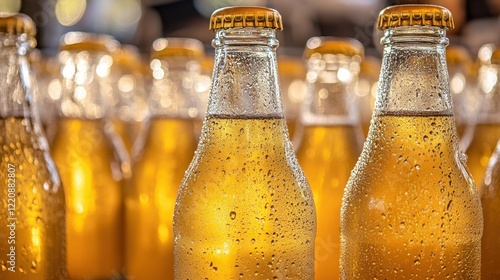 Close-up of condensation-covered glass bottles filled with golden beverage, showcasing a vibrant background
