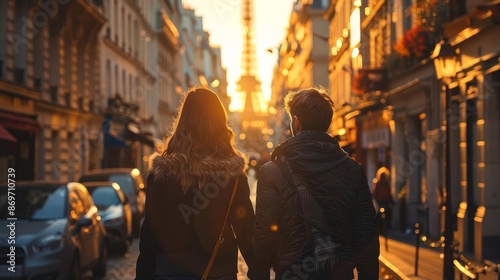 closeup of Couple walking in Paris Happy couple going on vacation together, walking down the streets of Paris , Golden Hour light, add copyspace for text