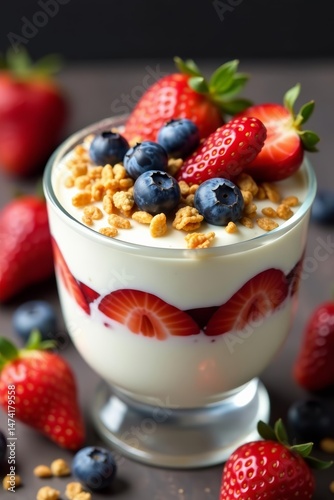 Close-up of creamy yogurt parfait with ripe strawberries, blueberries, and crunchy granola, healthy eating, nutritious, colorful