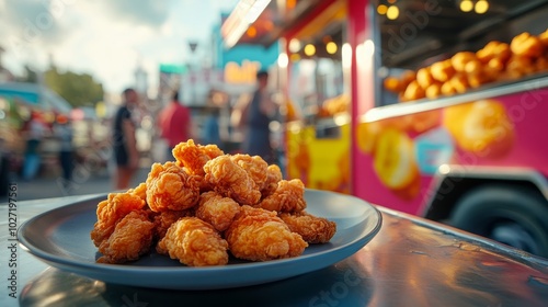 chicken, nugget, fried, crispy, food, truck, plate, blue, delicious, tasty, snack, meal, fast, seller, fair, festival, marketplace, street, market, crowd, people, background, blurred, bokeh, light, summer, outdoors, sunshine, day, gold, brown, table, metal, surface, texture, appetence, greasy, juicy, savoury, crunchy