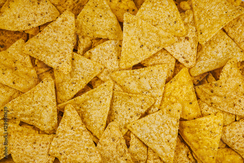 Close-up of crispy yellow corn tortilla chips. Traditional Mexican snack, ideal for nachos and dipping. Nachos