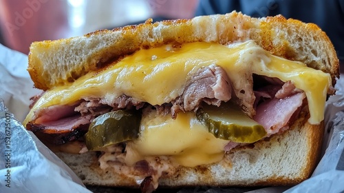 Close-up of Cuban medianoche sandwich with ham, pork, cheese, and pickles, toasted bread and gooey cheese