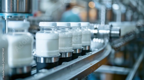 Close-up of dairy packaging equipment in action, showcasing the cleanliness and efficiency of the manufacturing process ,