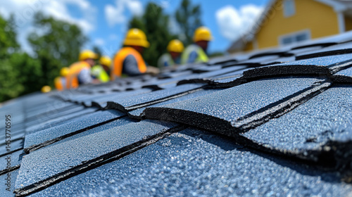 roof, shingle, asphalt, construction, men at work, team, safety, helmet, house, home, new, building, install, installation, roofing, residential, exterior, project, sunny, day, blue, grey, dark, closeup, texture, detail, material, professional, industry, job, site, crew, labor, process, progress, summer, sky, cloud, background, blurry, sharpened, perspective, angle, overhead, structure, craftsmanship, skilled, diligent