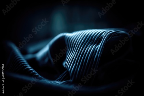 fabric, texture, dark, blue, stripes, fold, wrinkle, close, detail, lighting, dramatic, moody, pattern, material, design, clothing, textile, wrinkled, vertical, line, shadow, silhouette, darkened, night, still life, object, surface, detail, smooth, draped, curled, rippled, soft, structured, linen, patterned, crisp, contrast, shadowy, dim, detailed, deep