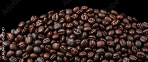Close-up of dark roasted coffee beans against a black backdrop; ample copy space, detail, organic