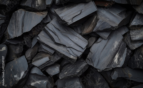 Close-up of dark, textured coal rocks stacked together.