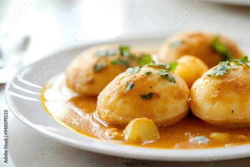 Close-up of delicious Indian Dum Aloo on white plate