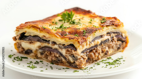 slice, garnish, plate, closeup, delicious, savoury, food, meal, cookery, bake, dish, cheese, aubergine, meat, herb, traditional, greek, mediterranean, casserole, dinner, epicure, culinary, hearty, appetising, oven, aromatic, taste, favor, homemade, texture, comfort, parsley, fresh, cheesy, tempting, creamy, layered, succulent