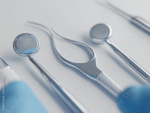 Close-up of dental instruments including mirrors and tweezers on a sterile surface.