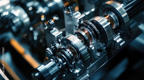 Close-up of Detailed Metal Gear System, Precision Engineering, Industrial Machinery, Complex Mechanism, Steel Gears, Chrome Parts