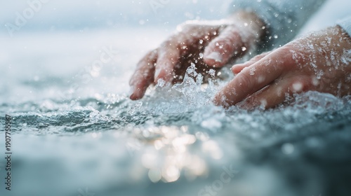 hand, diverse, adult, touching, icy, ocean, water, during, winter, closeup, cold, temperature, sensation, nature, sea, beach, coastal, environment, adventure, exploration, sensory, life events, skin, finger, connection, interaction, photo, portrait, people, human, detail, texture, lighting, shadow, minimalist, aesthetic, colours, contrast, blue, white, grey, swimming, splash, wet