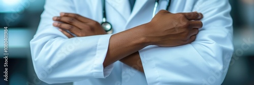 Close-Up of Doctor in White Coat and Blue Scrubs with Arms Crossed