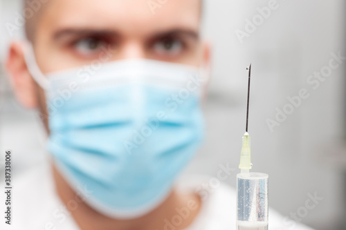 Close-up of doctor with medical mask preparing a syringe for vaccination