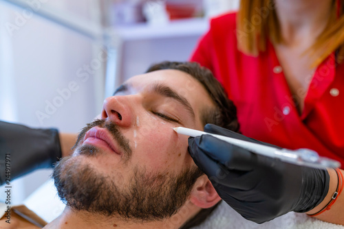 Close-up of doctor's hand drawing correction lines on good looking man's face. Procedure before plastic surgery.