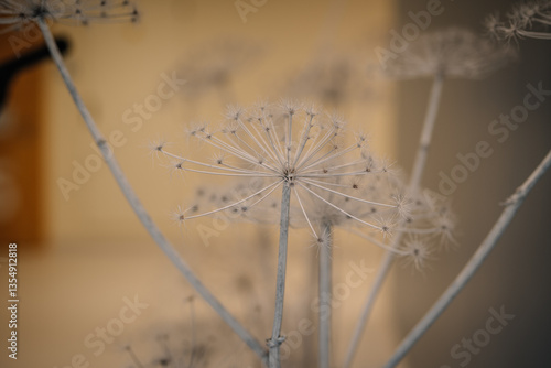 Close-up of dried dandelion-like seed heads in soft focus with a beige background, showcasing delicate structure and natural beauty..