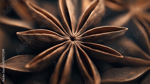 Close-up of dried star anise spice in a radial pattern with rich brown tones and textured details, showing its unique star-like shape in a macro perspective.
