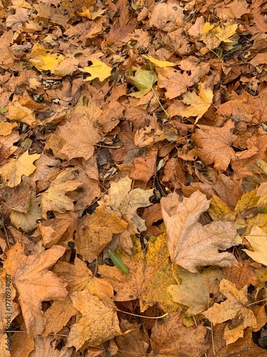Close-up of dry autumn leaves on the ground. Natural texture and warm earthy tones symbolizing fall season and change in nature.