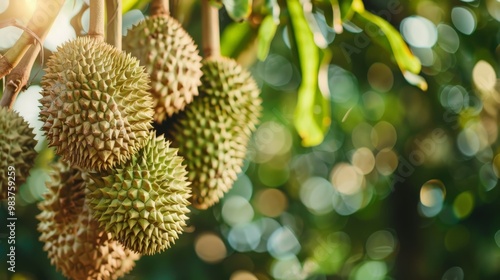 Close-up of durian spikes with a lush green background in an orchard