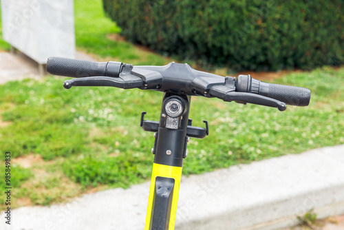 Closeup of electric scooter handlebars, outdoor view, modern urban transportation, innovation mobility concept