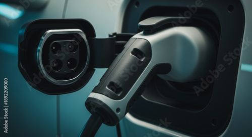 Close-up of Electric Vehicle (EV) Charging Plug and Port Connection. Sustainable Transportation, Future Mobility, and Clean Energy Technology Infrastructure.