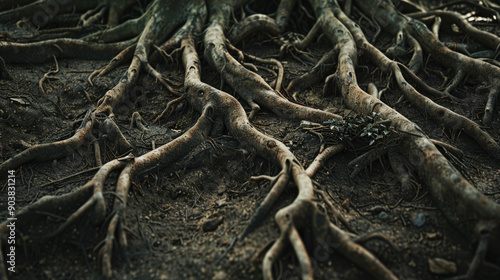 Close-up of exposed tree roots sprawling across the forest floor, capturing the intricate, raw beauty of nature's underground network.