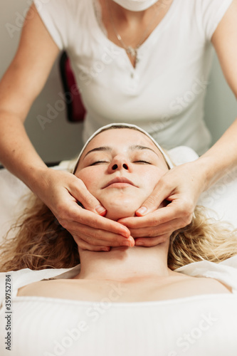 Close-up of face massage treatment. Young Caucasian woman. Beauty treatments