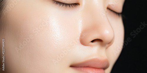 face, skin, closeup, nose, cheek, eye, closed eyes, texture, sheen, dewy, smooth, skincare, beauty, portrait, female, woman, light, gloss, soft, pale, peach, pink, lip, eyelash, porcelain, complexion, natural, healthy