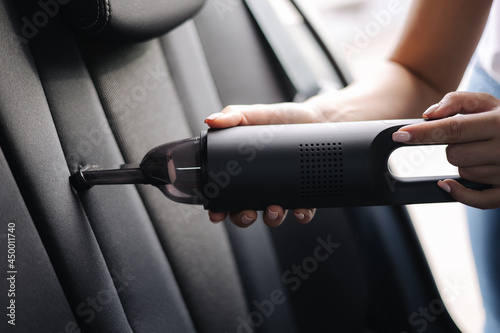 Close-up of female using portable vacuum cleaner in her car. Car interior cleaning. Woman vacuuming seats. Dust and dirt removal