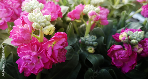 Close-up of flower bed with blooming flowers and buds of terry pink levkoy Matthiola incana,or double-flowered hoary stock,among dense foliage in garden on sunny day.Selective focus on one of flowers