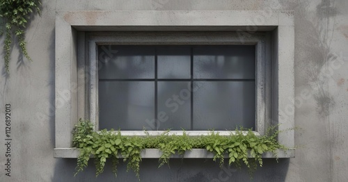 Close-up of foliage framing a window on a gray concrete wall, close-up, leaves, minimal, simple