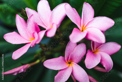 close-up of frangipani plumeria plant with plenty of pink flowers