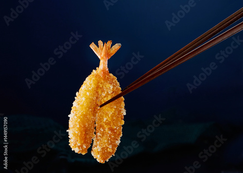 Closeup of fresh fried shrimp picked up with chopsticks